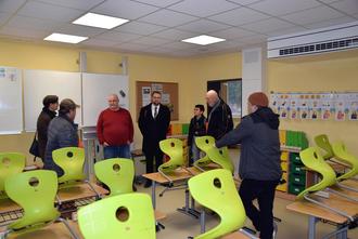 Die Besichtigung begann im Untergeschoss des Gebäudes. Hier soll ein „Grünes Klassenzimmer“ entstehen. Durch Unterricht im Freien soll die Konzentration der Kinder gefördert sowie mit Bewegung und Frischluft der Lernerfolg gesteigert werden. Bereits an das Schulgebäude angebaut wurde ein Flur, der die Gebäude miteinander verbindet. So konnten die Klassenräume vergrößert werden. Dies ist ein wichtiger Schritt, da zum nächsten Jahr mehr Schulanmeldungen erwartet werden. Weiterhin sind neue Fachräume geplant. Mithilfe der installierten Entlüftungsgeräte in jedem Raum war der Unterricht auch während der dreijährigen Sanierung möglich.