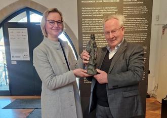 Monsignore Heinz Gunkel übergibt Oberbürgermeisterin Katja Wolf die Skulptur im Foyer der Predigerkirche.