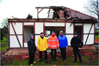 Schon im Vorfeld des Abbruchs hatten Siegfried Felsberg und Ortsteilbürgermeister Eckhard Pecher die Fenster ausgebaut und die Dachrinnen abgenommen. Nach Abschluss des Abrisses wird ein Pavillon aus Holz die Trauerhalle ersetzen. Damit entsteht ein würdiger Eingangsbereich zum Friedhof mit Sitzmöglichkeiten. Die Strauch- und Baumbepflanzung des Areals wird zukünftig mit klima- und grabartenangepassten Gehölzen erfolgen.