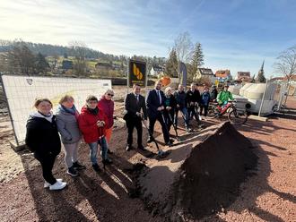 Am Spatenstich in Hörschel waren beteiligt (von links): die Einwohnerinnen Daniela Müller, Peggy Pohl, Monika Bley und Christel Bindel, Ortsteilbürgermeister Dr. Christian Hell, Oberbürgermeister Christoph Ihling, die frühere, langjährige Ortsteilbürgermeisterin Gisela Büchner, Planer Daniel Meyer, der Geschäftsführer der Baufirma, Mike Schüler, Michael Elmrich vom Kanuclub Rennsteig, Planerin Barbara Koch sowie Marco Höhn und Lutz von Nessen vom Verein Wartburg-Trails.