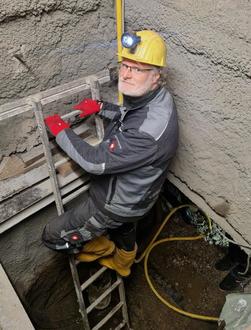Abstieg ins Gewölbe: Andreas Benthin vom geologischen Ingenieurbüro steigt den Schacht hinunter.