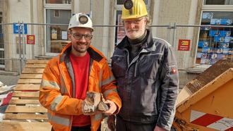 Erodierte Steine: Bauleiter Alfred Geers von TS Bau Jena (links) und Andreas Benthin vom geologischen Ingenieurbüro demonstrieren die Erosion im Gewölbe. In weit mehr als 100 Jahren hat das Wasser die großen Klinkersteine regelrecht zerrieben.