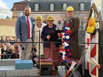 Den letzten Wagen gestalten die Sommergewinns-Originale. Diesmal waren Tante Frieda (Christiane Tomaske), Hermine (Heike Apel-Spengler) und Schorsch (Torsten Daut) in den Löbersbach abgetaucht und haben Oberbürgermeister Christoph Ihling (links) mit Funden aus der Unterwelt überrascht.