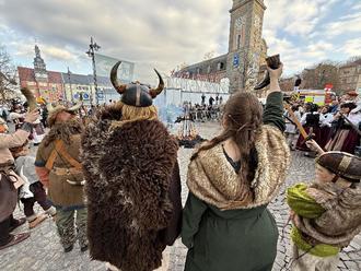 Höhepunkt des Festzugs war das Streitgespräch auf dem Markt. Wie bestellt kam die Sonne hinter den Wolken hervor und strahlte, als Frau Sunna (Anna-Katharina Heß) den Winter (Roberto Fink) bezwungen hat. Anschließend ist die Strohpuppe als Symbol der Niederlage des Winters verbrannt worden.
