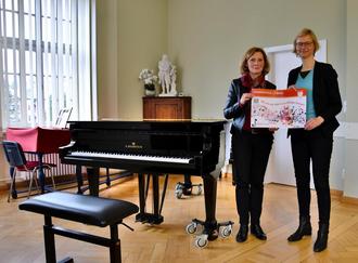 Sylvia Löchner, Fachdienstleiterin Musikschule, und Oberbürgermeisterin Katja Wolf (rechts) stellen die Feierlichkeiten im Rahmen des Musikschuljubiläums vor.