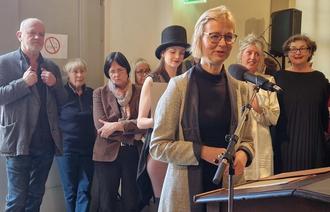Oberbürgermeisterin Katja Wolf begrüßte die Gäste, im Hintergrund die ehemalige Thüringer Ministerpräsidentin Christine Lieberknecht (Dritte von links) und der Künster Jost Heyder (ganz links).