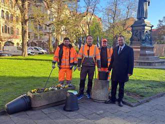Für die Papierkörbe im Bereich des Lutherdenkmals am Karlsplatz wurden neue Einsätze geliefert. Auf dem Bild zu sehen: Bürgermeister Christoph Ihling (rechts) mit den Mitarbeitern vom Fachgebiet Sauberkeit: Benjamin Mayer (v.l.), Markus Mayer, Sachbearbeiter Sauberkeit und Abfallrecht, sowie Markus Hamacek.