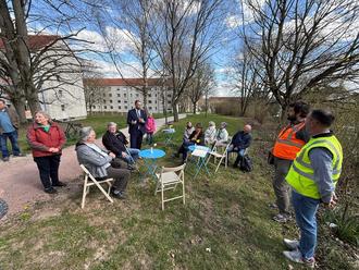 Oberbürgermeister Christoph Ihling hat zum Bürgerdialog „Auf ein Wort vor Ort“ ins Thälmannviertel eingeladen. Vor Ort sind Klappstühle und Tische aufgebaut gewesen.