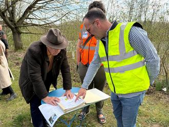 Auf Nachfrage eines Anwohners ist das besondere Verfahren der Wurzelbrücken erläutert worden. Um die stattlichen Bäume entlang des Weges zu erhalten, werden deren Wurzeln aufwendig geschützt. Dazu werden Pfähle, die wie große Schrauben aussehen, punktuell in die Erde eingebohrt. Darüber werden Gitterroste und Geotextilien gelegt. Den sichtbaren Abschluss bildet Pflaster.