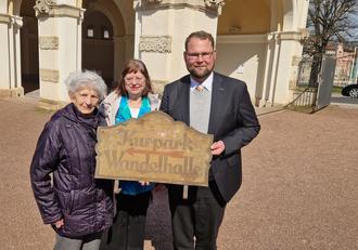 Rita Bergmann (von links) übergibt zusammen mit ihrer Tochter Halka Müller das Schild mit dem Hinweis zum Kurpark an Oberbürgermeister Christoph Ihling.
