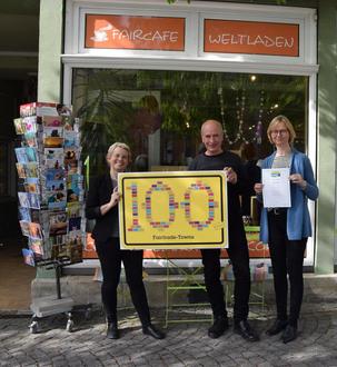 Von links: Diana Artschwager, Vorsitzende der Fairtrade-Steuerungsgruppe, Clemens Roschka, Vorsitzender Eine Welt Verein e.V., und Oberbürgermeisterin Katja Wolf mit der Fairtrade-Stadt Urkunde.