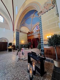 Neben dem Chorraum erhielt auch der Triumphbogen neue Farben, grünes Blattwerk über den seitlichen Türen hebt diese farblich ab. Hinzu kommt die Beleuchtung in Kugelform, die der ursprünglichen sehr nahekommt, und Olivenbäumchen sorgen für die Begrünung des Innenraumes nach historischem Vorbild.