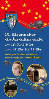Am 15. Juni findet in Eisenach der Veranstaltungshöhepunkt für Groß und Klein - die mittlerweile 19. KinderKulturNacht (KiKuNa) - statt. Wie üblich ist der Samstag vor den Sommerferien dafür reserviert. In diesem Jahr repräsentiert eine Spinne das Motto des Abends: „Die Welt im Untergrund - Kellergeschichten“. Das offizielle Logo wurde wie schon in den vergangenen Jahren über einen Malwettbewerb gekürt. Aus mehr als 700 Einsendungen musste die Jury das Motiv der diesjährigen Kinderkulturnacht wählen. Die Siegerspinne wird natürlich im Programmheft und an vielen Stellen der Stadt zu finden sein.