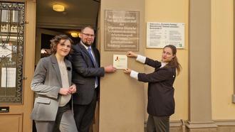 Elisabeth Kaiser, Ostbeauftragte der Bundesregierung, Oberbürgermeister Christoph Ihling und Tina Rudolph, Geschäftsführerin der August-Bebel-Gesellschaft (von links), bringen ein Schild an der Gedenkstätte „Goldener Löwe“ an. Damit wird auf die Bundesförderung aufmerksam gemacht.