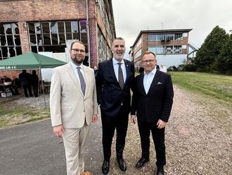 Oberbürgermeister Christoph Ihling (links) und der Vorsitzende des Gewerbevereins, Jo West, begrüßen Thüringens Minister für Digitales, Steffen Schütz (Bildmitte).