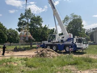 Auf dem neu entstehenden Mehrgenerationen-Spielplatz im Eisenacher Thälmannviertel, wurde am Donnerstag, 8. Juni, die unter Denkmalschutz stehende Elefantenrutsche umgesetzt. Die Mitarbeiter der Baufirma entfernten fachmännisch den Elefanten an seinem alten Standort und installierten diesen auf dem neuen dafür vorgesehenen Gelände direkt gegenüber.