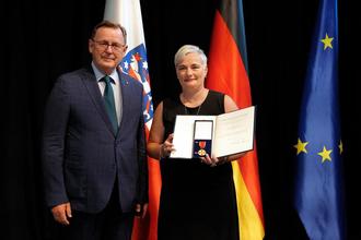 Die Ehrenamtliche Beigeordnete der Stadt Eisenach hat am Mittwoch, 21. Juni, in Erfurt für ihr engagiertes Wirken eine hohe Auszeichnung erhalten. Ihr wurde die Verdienstmedaille des Bundesverdienstordens der Bundesrepublik Deutschland verliehen. Im Namen von Bundespräsident Frank-Walter Steinmeier wurde diese durch den Ministerpräsidenten Bodo Ramelow überreicht. Ausgezeichnet wurde Heike Apel-Spengler für ihr vielfältiges ehrenamtliches Engagement.