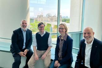 Fröhliche Gesichter bei Eisenachs Delegation nach dem Gespräch mit Carsten Schneider, Staatsminister beim Bundeskanzler und Beauftragter der Bundesregierung für Ostdeutschland im Kanzleramt (v.r.n.l.): Ralf Uwe Beck, Oberbürgermeisterin Katja Wolf, Max von Trott zu Solz und Steffen Schütz.