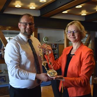 Katja Wolf dankte ihren beiden Vertretern Christoph Ihling sowie dem Hauptamtlichen Beigeordneten Ingo Wachtmeister für die konstruktive Zusammenarbeit in den vergangenen Jahren. Dann übergab sie ihrem Nachfolger die Amtskette.