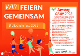 In der Bibliothek können Kinder an einem Naturschutzparcours ihr Wissen testen, an einem Glücksrad ihr Glück versuchen und kleine Präsente gewinnen. Es gibt eine Hüpfburg, Kinderschminken und andere Überraschungen. Gegen 14 Uhr bereichert der Fanfarenzug der Wartburgstadt Eisenach mit seinem Auftritt das Bibliotheksfest.