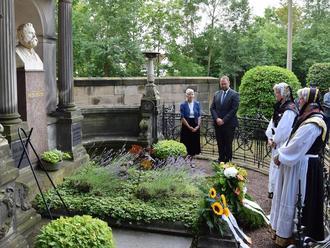 Oberbürgermeister Christoph Ihling und Renate Drefahl (Vorsitzende des Förderverein Reuter-Museen e.V.) bei der Kranzniederlegung am Ehrengram Reuters