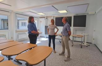 Der Hauptamtliche Beigeordnete Ingo Wachtmeister, Oberbürgermeisterin Katja Wolf und Bernd Wächter (Schulverwaltung) in einem der Schulcontainer des Elisabeth-Gymnasiums.