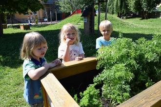 Emily (von links), Mathilda und Malte zeigen das Hochbeet. Hier bauen die Kinder selbst Gemüse an, das sie selbst ernten.