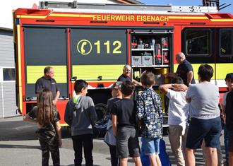 Die Kameraden der Freiwilligen Feuerwehr Stregda zeigen den Grundschülern Technik und Geräte, die in einem Feuerwehrfahrzeug stecken.