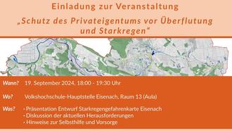 Die städtische Klimaschutzmanagerin der Stadt Eisenach sowie der Fachdienst Feuerwehr geben Einblicke in bisherige Bemühungen zur Prävention sowie Bewältigung der Auswirkungen solcher Ereignisse. Aktuelle Herausforderungen werden erläutert und Hinweise zur Eigenvorsorge gegeben. Zudem wird ein erster Entwurf einer Starkregengefahrenkarte für Eisenach präsentiert, mit der das Risiko für verschiedene Stadtgebiete bewertet wird. Hieraus lassen sich wichtige Informationen für Einwohnerinnen und Einwohner ableiten. Der Vortrag findet am Donnerstag, 19. September 2024, um 18 Uhr in der Volkshochschule Eisenach (Schmelzerstraße 19, Raum 13) statt. Das Angebot ist kostenfrei.