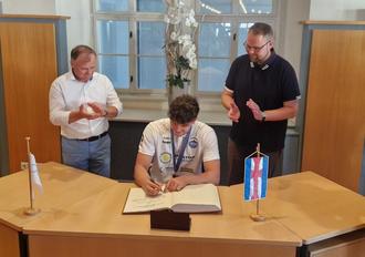 Oberbürgermeister Christoph Ihling gratulierte: „Wir sind unheimlich stolz auf Euch beide, Marko und Johannes. Euer Beispiel zeigt: Mit Beharrlichkeit, Ausdauer und hartem Training kann man es ganz weit bringen. Ihr seid ein Vorbild für die Jugend und Euer Erfolg ist eine Ehre für die ganze Stadt.“ Gemeinsam mit dem ThSV Eisenach hatte die Stadt Eisenach zum Empfang in den Ratssaal geladen. Der Eintrag ins Goldene Buch war da obligatorisch - und zumindest für Johannes Voigtmann keine Premiere. Als die Deutsche Nationalmannschaft im vergangenen Jahr Weltmeister wurde, hatte sich der 2,11 Meter große Mann bereits schon einmal mit seiner Unterschrift verewigt. Als Geschenk überreichte Christoph Ihling den Sportlern unter anderem Gutscheine für eine Ausfahrt im historischen Wartburg auf die Wartburg, gesponsert vom Wartburgfahrerclub Eisenach.