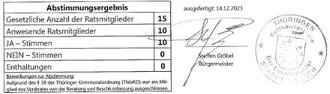 „Der Stadtrat der Stadt Ebeleben beschließt gem. § 19 ThürKO i.V.m. § 10 BauGB den vorhabenbezogenen Bebauungsplan „Solarpark Ebeleben" der Stadt Ebeleben in der Fassung vom 09.10.2023 als Satzung. Die Planzeichnungen und die städtebauliche Begründung, der Umweltbericht mit integriertem Artenschutzfachbeitrag sowie 4 Anlagen: 1-Faunagutachten, 2-Bodengutachten, 3-Fotodokumentation, 4-Biotoptypenkarte wird gebilligt und als Satzung beschlossen.