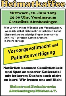 Wir freuen uns auf eine schöne Kaffeerunde mit interessanten Gesprächen und laden daher alle Interessierten ganz herzlich zu unserem 2. Heimatkaffee am Mittwoch, den 18. Juni 2025 um 15.00 Uhr in die Gaststätte nach Abtsbessingen ein!