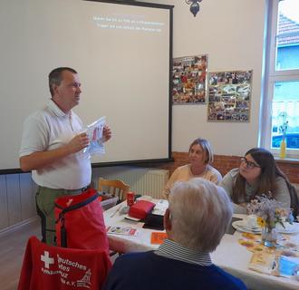 Auf großes Interesse traf der Vortrag „Richtiges Verhalten in Notsituationen“ von Sven Oesterheld (DRK Sondershausen) beim Heimatkaffee des HFV am 8. November in Abtsbessingen. So folgten insgesamt über vierzig Zuhörer der Einladung unseres Vereins und fanden den Weg in die Gaststätte am Lindenplatz. Dort hatten die fleißigen Vereinsfrauen in gewohnter Manier Kuchen und Torten zum Kaffee „gezaubert“ und damit die Gäste schon kulinarisch auf einen angenehmen Nachmittag eingestimmt.