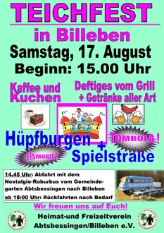 Am 17. August findet ab 15.00 Uhr unser traditionelles Teichfest in Billeben statt, zu dem wir Groß und Klein ganz herzlich einladen! Neben einer Kaffee- und Kuchentheke gibt es eine Spiel-, Mal- und Bastelstraße mit Hüpfburgen, Kinderschminken u.v.m.