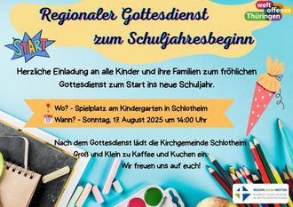 | 14.00 Uhr | Schlotheim, Spielplatz am Kindergarten, Zentral Gottesdienst zum Schulbeginn |