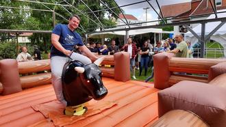 Schon früh am Nachmittag eröffnete unser „Sheriff" und Ortsteilbürgermeister Pascal Muth das Sommerfest der Dorfgemeinschaft Wiedermuth e.V.. Zum Motto passend standen die Attraktionen bereit: während 2 Bingo-Runden, Hufeisenwerfen und Wett-Nageln für freundschaftlichen Wettkampf sorgten, war die Saloon-Hüpfburg der heimliche Favorit der Kleinsten. Die Bull Riding Maschine brachte mutige Reiter ins Wanken. Groß und Klein, Alt und Jung haben Ihre Reitkünste im Turnier unter Beweis gestellt. Huch, wer hat da gewonnen? Das fragt man sich später beim Kuchenbuffet ...