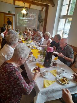 Vorstandsvorsitzende Jana Dölle begrüßte die Anwesenden und freute sich, dass trotz der Hitze so viele der Einladung zum Heimatkaffee gefolgt waren. Die Vereinsfrauen hatten Kaffee gekocht und Kuchenköstlichkeiten gebacken, denen die circa dreißig Gäste nach der Begrüßung dann auch sehr gern zusprachen.