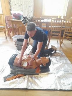 So wiederholte die ehrenamtliche DRK-Helferin mit uns nicht nur die lebensrettenden Sofortmaßnahmen (stabile Seitenlage, Herz-Lungen-Wiederbelebung) und andere wichtige Grundlagen der Ersten Hilfe, sondern hatte auch auf alle Fragen der Teilnehmer fundierte Antworten.
