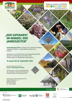 Im sechsten und letzten Projektjahr seines im Bundesprogramm Biologische Vielfalt geförderten Hotspot-Projektes „Gipskarst Südharz - Artenvielfalt erhalten und erleben“ lädt der Landschaftspflegeverband Südharz/Kyffhäuser e.V. (LPV) wieder zu einem Fotowettbewerb ein. Dabei soll noch einmal die wunderschöne, interessante, abwechslungsreiche, artenreiche und aufgrund all dessen besonders schützenswerte Gipskarstlandschaft des Südharzes in Fotografien festgehalten werden. Willkommen sind Aufnahmen der Landschaft, einzelner Lebensräume, Pflanzen, Tiere und urbaner Strukturen im Wandel der Jahreszeiten. Die Jahreszeiten mit ihren verschiedenen Vegetations-, Witterungs- und Lichtverhältnissen machen für Fotografinnen und Fotografen einen besonderen Reiz aus und bieten eine Vielzahl an Motiven, die auf Spaziergängen und Wanderungen im Südharz entdeckt werden können.
