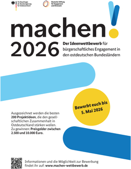 Der Wettbewerb der Beauftragten der Bundesregierung für Ostdeutschland wird 2026 bereits zum siebten Mal durchgeführt. Seit 2023 wird „machen!“ in Kooperation mit der Deutschen Stiftung für Engagement und Ehrenamt ausgerichtet. Die Deutsche Stiftung für Engagement und Ehrenamt hat im Juli 2020 ihre Arbeit in Neustrelitz aufgenommen. Mit der Stiftung gibt es erstmals eine bundesweite Anlaufstelle zur Förderung ehrenamtlichen Engagements. Sie berät, qualifiziert, fördert und vernetzt Engagierte und Ehrenamtliche und unterstützt diese insbesondere in ländlichen und strukturschwachen Räumen.