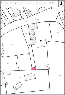 | 1. | Das Grundstück in der Gemarkung Abtsbessingen Flur 1, Flurstück 96/1 wird mit öffentlicher Bekanntmachung dieser Allgemeinverfügung als öffentliche Verkehrsfläche eingezogen. |