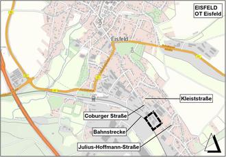 Der Geltungsbereich umfasst in der Gemarkung Eisfeld, Flur 0 die Flurstücke 1415/11 und 1385/45 (teilweise). Er liegt zwischen der Bahnstrecke von Eisfeld nach Schalkau und der „Coburger Straße“ im Bereich zwischen den Einmündungen der „Kleiststraße“ im Norden und „Julius-Hoffmann-Straße“ im Süden.