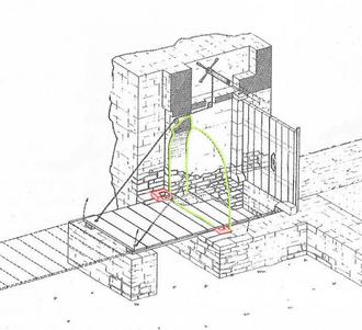 Original-Abb. Christopher Hermann (2015): Fallgatter und Zugbrücken. In: „Dem Feind zum Trutz“ - Wehrelemente an mittelalterlichen Burgen. Veröffentlichungen der Deutschen Burgenvereinigung e.V., Bd. 14, Stuttgart 2015.S. 153 ff. (digital neu bearbeitet Heiko Haine).