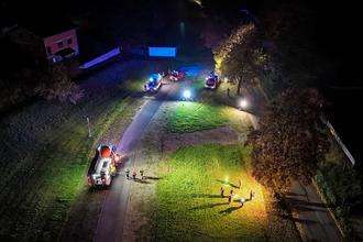 Nach dem anstrengenden Einsatz ging es mit allen Beteiligten zu einem gemeinsamen Abendessen im Gerätehaus Sachsenbrunn. Vor dem wohlverdienten Feierabend wurde noch einmal die Unterstützung der Feuerwehr Eisfeld auf dem Volkshausplatz benötigt. Gegen 19:20 Uhr hat sich ein fiktiver Rettungshubschrauber angekündigt, der durch eine Drohne des Kameraden Marcus Heinz simuliert wurde. Hierfür musste eine entsprechende Landefläche großzügig ausgeleuchtet werden.