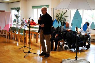 Die diesjährige Jubiläumsfeier stand ganz unter dem Motto „Gott lässt uns nicht im Regen stehen“, worauf sich auch Pfarrer Steffen Pospischil in seiner Andacht konzentrierte. „Selbst, wenn der Wind stürmisch weht - ein Regenschirm hält doch den größten Teil des Wassers ab“, sagte er. „Und wenn die Sonne mir allzu stark auf den Kopf scheint, setze ich entweder meine Schirmmütze auf oder nehme einen Sonnenschirm zur Hand“, fuhr er fort und bewies, dass so ein Schirm doch eine fabelhafte Erfindung sei. Im übertragenen Sinne sei auch die Tagesförderstätte ein Schirm, ein Bereich, in dem die Beschäftigten in Ruhe arbeiten, gefordert und gefördert werden könnten. „Und es ist wichtig, dass es diese Einrichtung gibt, denn eure Arbeit ist wichtig“, ergänzte er.