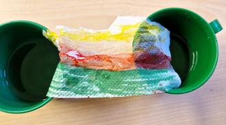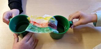 Da es keinen Schnee gibt, haben wir mit Eis und Raureif gespielt und Experimente gemacht. Auch Skifahrer aus Papier und Schneemänner aus Schaumkugeln stehen in unserem Gruppenraum. Mit Farbe, Löschpapier und Wasser entstehen Regenbögen.