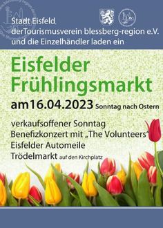 Die Vorbereitungen für den diesjährigen Frühlingsmarkt am Sonntag, den 16. April 2023 laufen in Eisfeld auf Hochtouren. Der Tourismusverein blessberg-region e.V. und die Stadt Eisfeld, laden für die Zeit, von 10.00 Uhr bis 18.00 Uhr in die Innenstadt ein. Wie in den vergangenen Jahren werden zahlreiche Händler entlang der Marktstraße und auf dem Marktplatz, ihre Waren anbieten. Die Gewerbetreibenden und Einzelhändler öffnen um 13.00 Uhr ihre Läden in der Innenstadt. Frühaufsteher haben schon ab 8.00 Uhr die Möglichkeit den Krammarkt an der Kirche zu besuchen. Dort finden alle Liebhaber von alten und gebrauchten Sachen, Dinge des täglichen Bedarfs, aber vielleicht auch kleine Schätze. Auf dem Edeka-Parkplatz werden einige Autohäuser mit ihren Fahrzeugneuheiten präsent sein und eine Automeile bilden. Hier finden dann alle Autobegeisterten, moderne Antriebsarten, coole Fahrzeugtypen und fachkundige Beratung. Auch für die kleinen Besucher wird es einige Angebote geben, wie zum Beispiel eine Hüpfburg. Für das leibliche Wohl wird ebenso gut gesorgt und den Besucher erwarten auch regionale Spezialitäten. Zu einem Benefizkonzert laden „The Volunteers“ ab 16.30 Uhr auf dem Kirchplatz ein. Dieser kulturelle Höhepunkt stellt den finalen Höhepunkt des Markttreibens am Sonntag nach Ostern in Eisfeld dar. Die Stadt, der Tourismusverein, die Einzelhändler und Gewerbetreibenden sowie die zahlreichen Markthändler freuen sich auf ihren Besuch in Eisfeld.