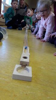 Der vierte Gegensatz, mit dem sich die Kinder beschäftigen konnten, war SCHNELL und LANGSAM. Hier ging es um die Fragen: Was kann man alles schnell und langsam machen? Wie muss ich meine Kugelbahn bauen, damit die Kugel noch schneller wird? Wie wird ein Blatt Papier schneller?