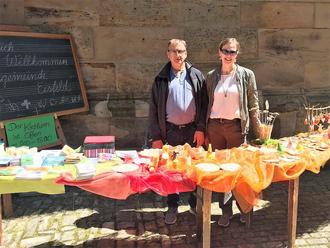 Eisfeld - Zum diesjährigen Kuhschwanzfest waren Vertreter der Kirchgemeinde Eisfeld und der Werkstätten für angepasste Arbeit (Wefa) Eisfeld/Hildburghausen mit einem gemeinsamen Stand auf dem historischen Markt an der Kirche vertreten, an dem besonders am Vormittag reger Andrang herrschte. Verena Müller vom begleitenden Dienst der Wefa Hildburghausen vertrat nicht nur die Werkstatt, sondern auch die Eisfelder Kirchgemeinde, und Werkstattrat Michael Skalda repräsentierte die Wefa Eisfeld. Grundschüler Johannes Krapp unterstützte die beiden zeitweise tatkräftig zusammen mit seiner Schwester Luise vom integrativen Diakonie-Kindergarten „Pfiffikus“ in Eisfeld. Ein herzliches Dankeschön an dieser Stelle für die tolle Hilfe.