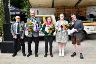 v. l.: 1. Schützenmeister Dieter Otto, Schützenkönig Michael Schmidt, Jungschütze Laura Güther, Schützenkönigin Isabel Jansen, Eisfelds Bürgermeister Christoph Bauer